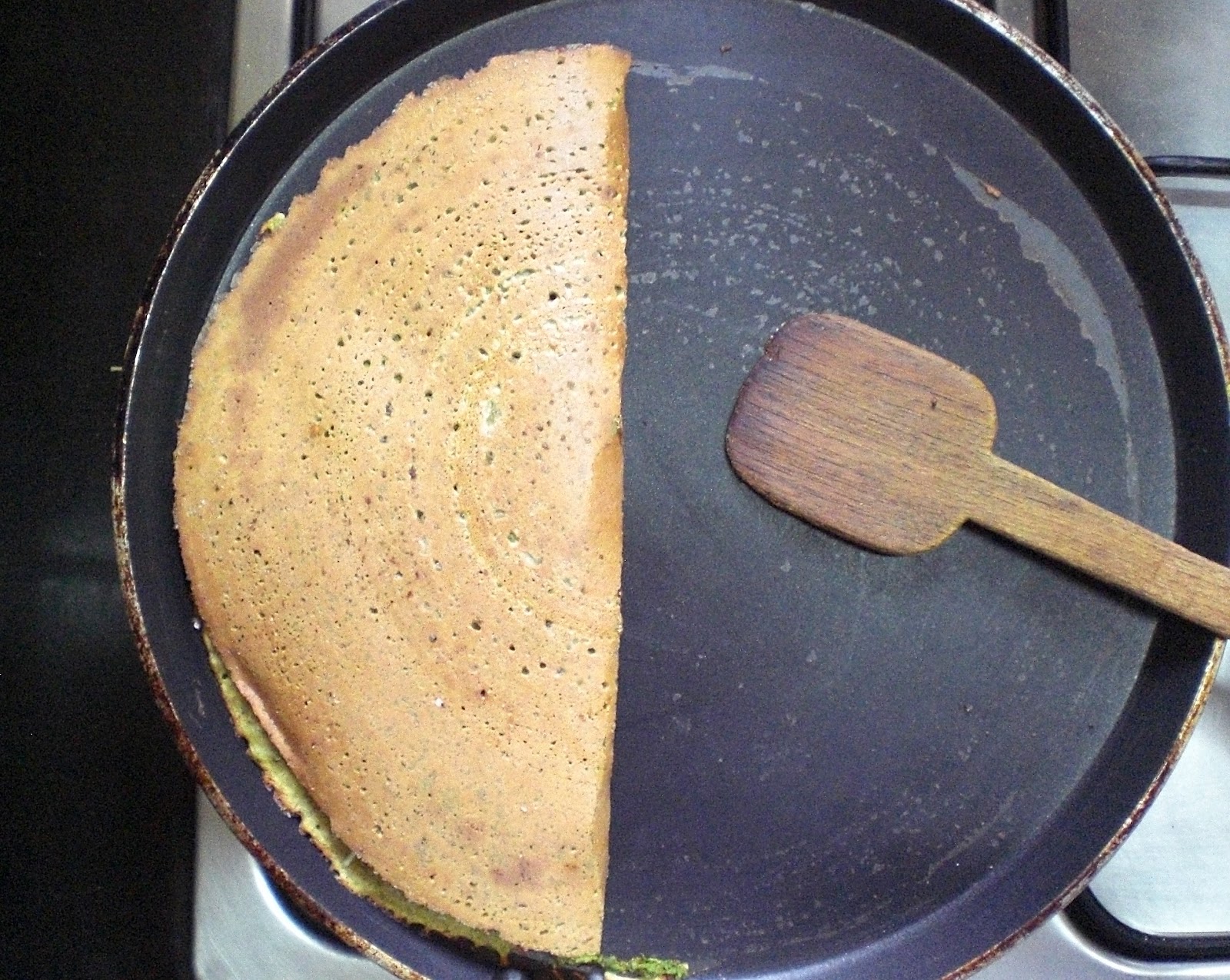 minute, spread the pesto on the dosa. After another minute, spread the
